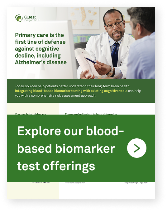This includes our panel, AD-Detect™ ABeta 42/40 and p-tau217 Evaluation, which combines Aβ 42/40 and p-tau217 plasma levels to help establish the likelihood of amyloid pathology consistent with Alzheimer's disease, evaluated at 91% sensitivity and 91% specificity—meeting accepted performance standards for blood-based biomarker tests.9,10